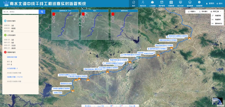 南水北調中線干線工程巡查維護管理系統(覆蓋中線全線機電設備巡查管理,實現巡查問題的實時發現與處理)