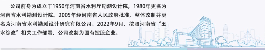 公司前身可追溯至1950年成立的河南省治淮總指揮部計劃處,1956年與河南省水利廳勘測設計處合并成立了河南省水利廳勘測設計院,1980年更名為河南省水利勘測設計院。2005年經省人民政府批準,整體改制為科技型企業,并更名河南省水利勘測設計研究有限公司。2022年9月,根據河南省委、省人民政府“五水綜改”相關工作部署,公司積極推進股權重組,由河南水利投資集團有限公司控股51%,公司改制為國有控股企業。
