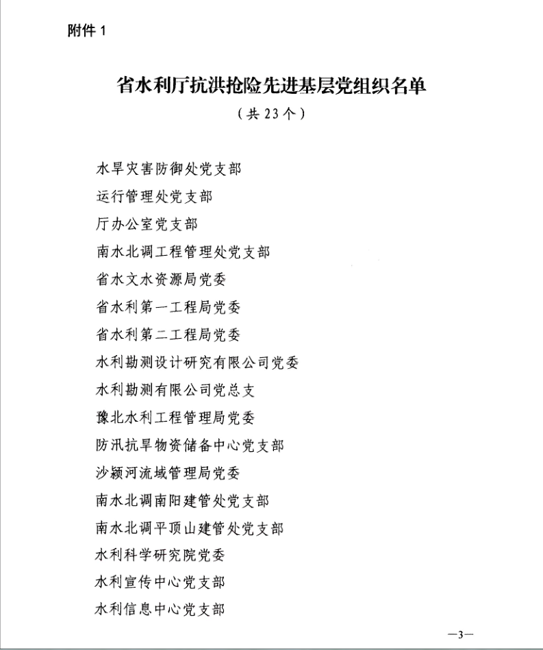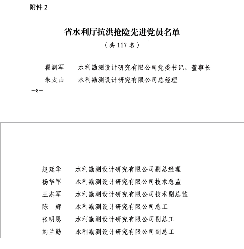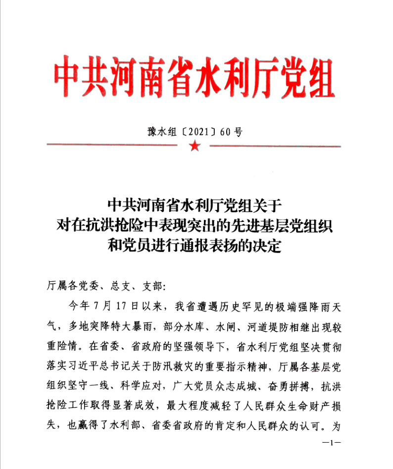8月9日,省水利廳黨組以豫水組【2021】60號文下發(fā)了《關(guān)于對在抗洪搶險(xiǎn)中表現(xiàn)突出的先進(jìn)基層黨組織和黨員進(jìn)行表彰的決定》,公司黨委作為省水利廳抗洪搶險(xiǎn)先進(jìn)基層黨組織,翟淵軍、朱太山、趙廷華、楊華軍、王志軍、陳輝、張明恩、劉蘭勤等8名黨員同志作為省水利廳抗洪搶險(xiǎn)先進(jìn)黨員受到通報(bào)表揚(yáng)。