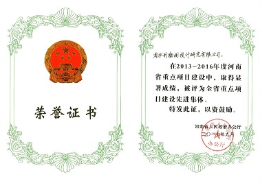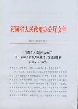 8月16日,河南省人民政府辦公廳發布《關于表彰全省重點項目建設先進集體和先進個人的決定》 [豫政辦〔2017〕92號]文件,對鄭州城建集團投資有限公司等40個先進集體和賈要偉等114名先進個人予以表彰,設計公司被評為全省重點項目建設先進集體。全文內容如下: