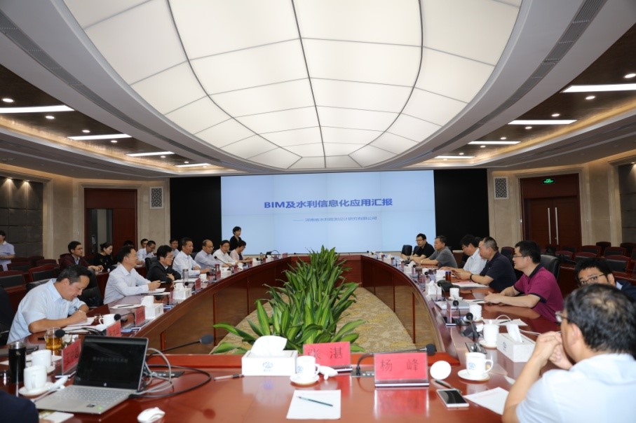 劉偉平總工一行首先聽取了我公司《BIM技術在水利工程中的應用及水利信息化建設發展情況》的匯報,并對BIM技術在水利行業的發展情況、應用過程中提高設計產品質量、效率情況,以及在工程數字化移交、運行維護管理中的應用情況、存在問題等進行了深度討論,隨后又聽取了我省172項全國重點水利工程之一的-出山店水庫工程BIM及信息化應用情況的專題匯報,對我公司在BIM技術及信息技術等新技術應用方面取得的成績給予肯定,并希望我公司在今后的工程設計過程中繼續進行新技術的探索和應用,通過不斷學習調研、實踐、探索出一條智慧水利新路子,從設計階段延伸到工程全生命周期的應用,推動河南水利在新技術的應用水平而努力。同時也要求我公司在近期即將在信陽出山店水庫舉行的全國水利工程信息化建設現場交流會上做《BIM與信息化技術在水利工程建設中的創新應用》的主題發言。