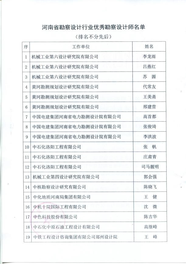 安增強、耿昕、劉曉琴同志獲得河南省勘察設計協會給予的“河南省優秀青年勘察設計師”表彰;寧保輝、馬山玉、白勇、魏常琦同志被河南省工程勘察設計行業協會列入“第一屆中原杰出青年勘察設計人才”培養名單;劉蘭勤、侯曉輝同志被河南省水利學會評為“中原水利英才”。