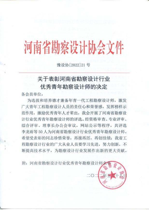 為進一步推動人才強省戰略實施,激勵全省優秀青年科技人才建功立業,為著力打造“設計河南”增光添彩,2022新年伊始,河南省勘察設計協會、河南省工程勘察設計行業協會、河南省水利學會先后舉行全省優秀青年人才選拔系列活動。經公司推薦,相關協會、學會評宣,公司安增強等9位同志在眾多申報者中脫穎而出并贏得多項榮譽。