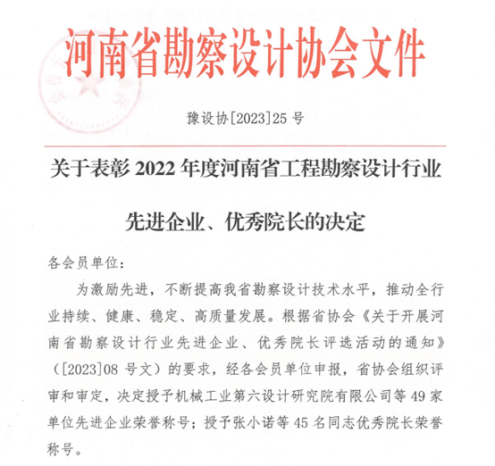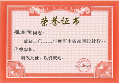 近日,河南省勘察設計協(xié)會發(fā)布《關于表彰2022年度河南省工程勘察設計行業(yè)先進企業(yè)、優(yōu)秀院長的決定》,公司榮獲“2022年度河南省勘察設計行業(yè)先進企業(yè)”稱號,公司董事長翟淵軍同志被評為“2022年度河南省勘察設計行業(yè)優(yōu)秀院長”。