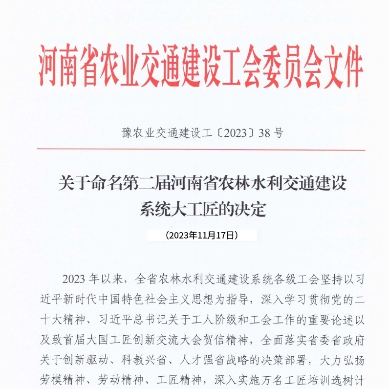 11月17日,河南省農業交通建設工會委員發布命名決定,豫水設計公司數字工程院總工屈志剛同志被命名為第二屆河南省農林水利交通建設系統大工匠,獎勵個人1萬元。本屆評選,由公司申報、水投集團推薦,屈志剛同志從眾多申報者中脫穎而出,為公司贏得榮譽。