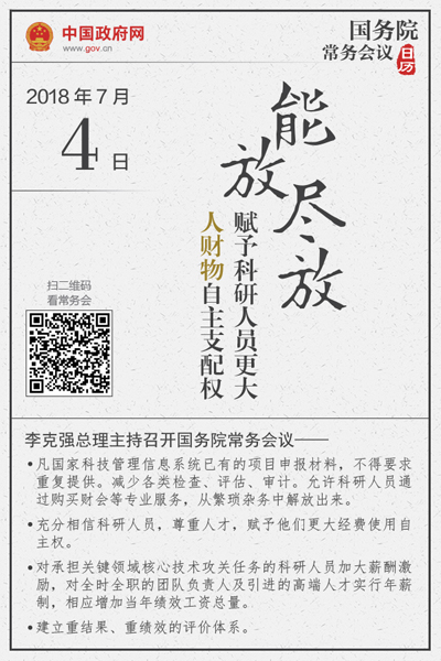 當天會議確定進一步擴大科研人員自主權的措施。李克強指出,要落實習近平總書記在兩院院士大會上的重要講話精神,按照黨中央、國務院部署,深化科技領域“放管服”改革,按照能放盡放的要求賦予科研人員更大的人財物自主支配權,充分調(diào)動他們的積極性,激發(fā)創(chuàng)新活力,壯大經(jīng)濟發(fā)展新動能。